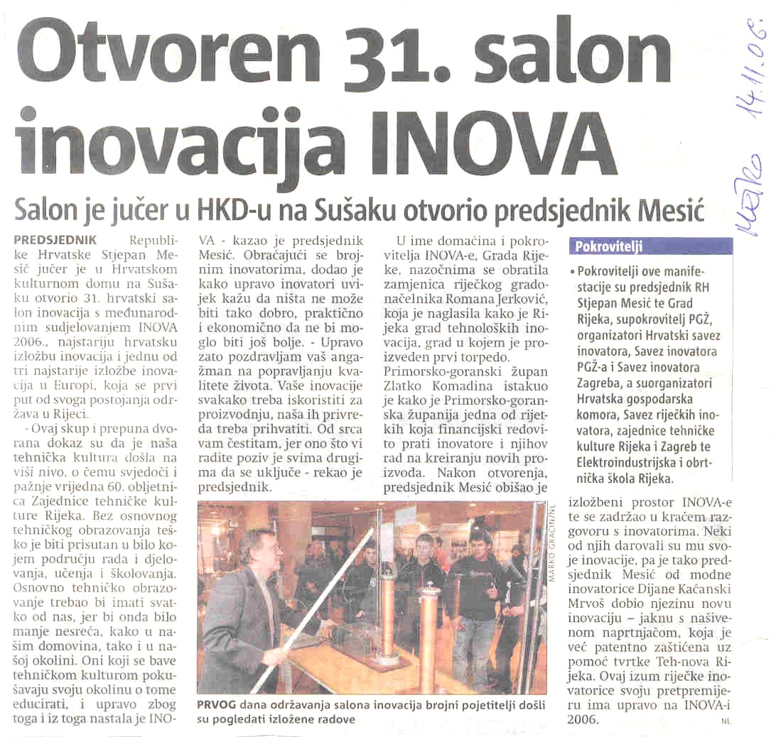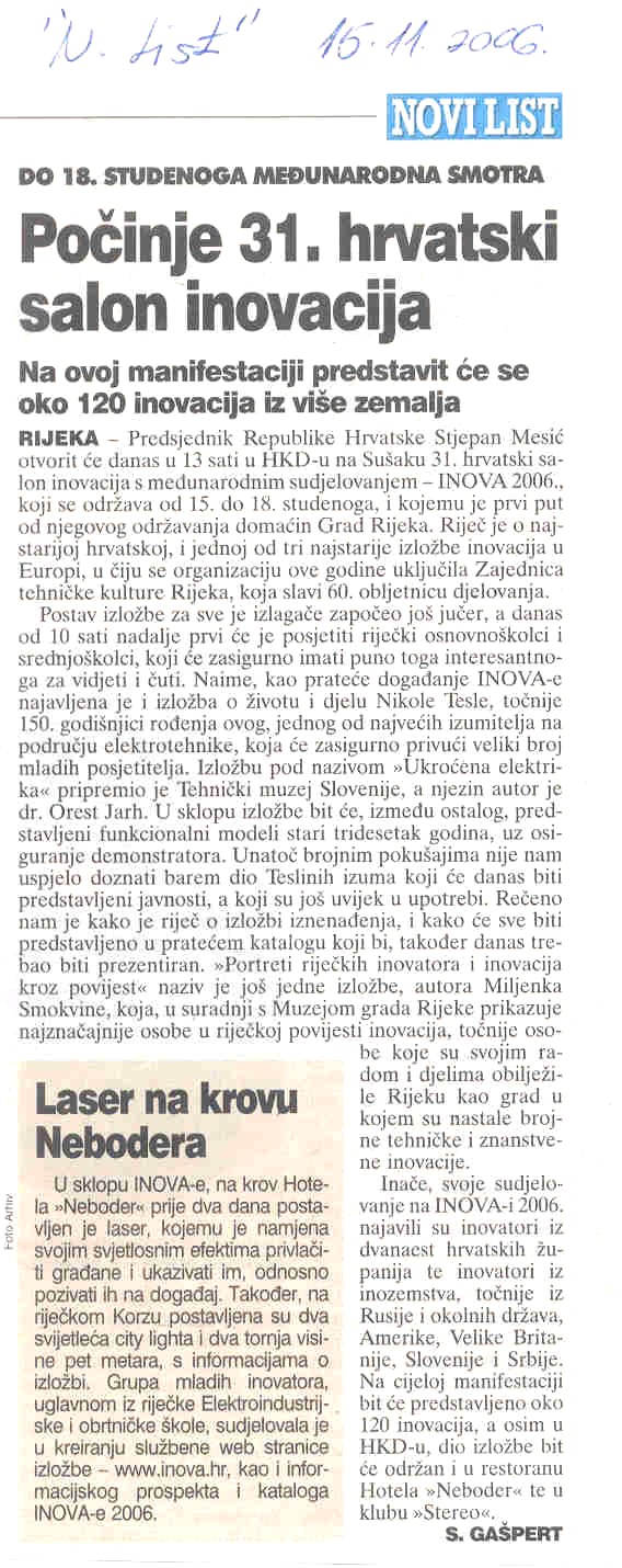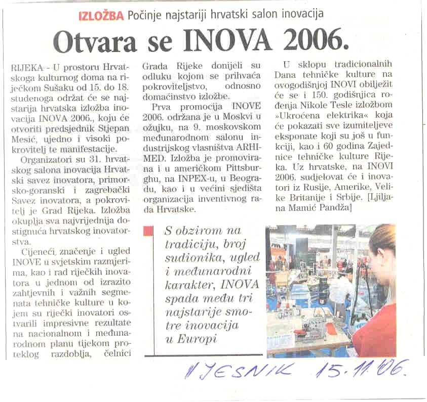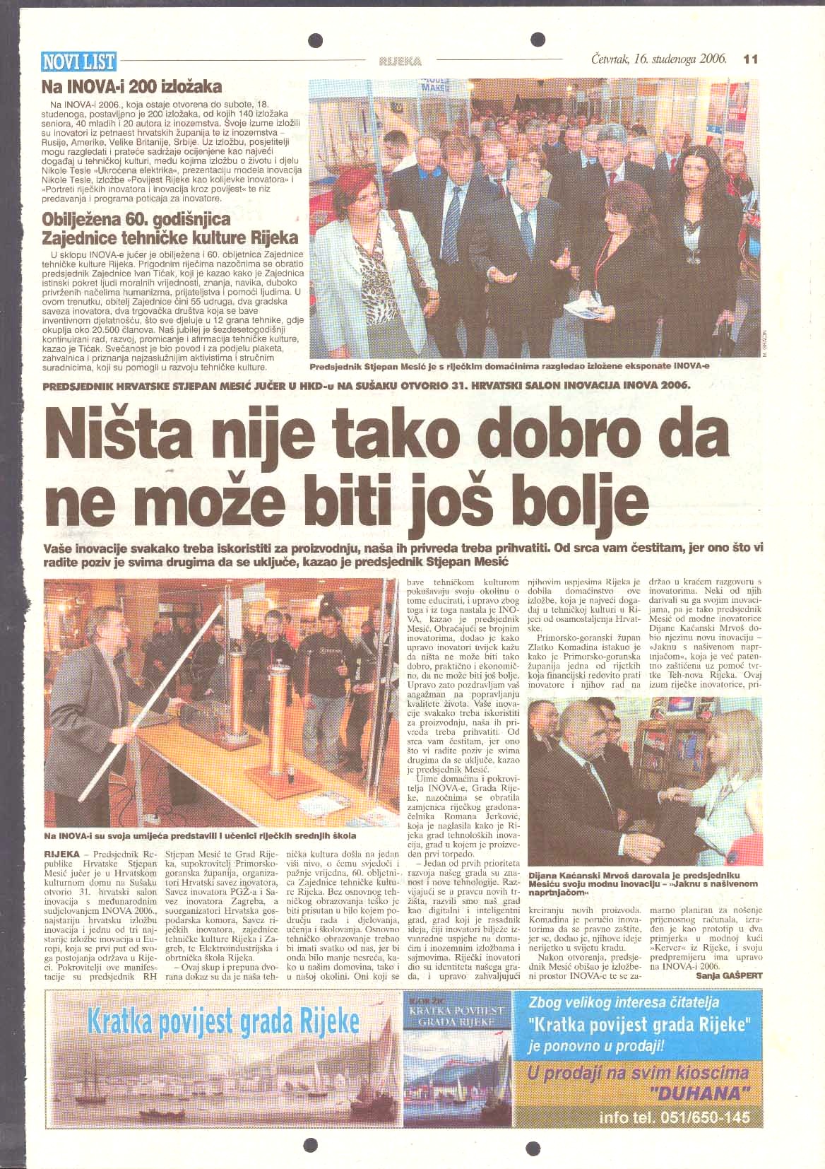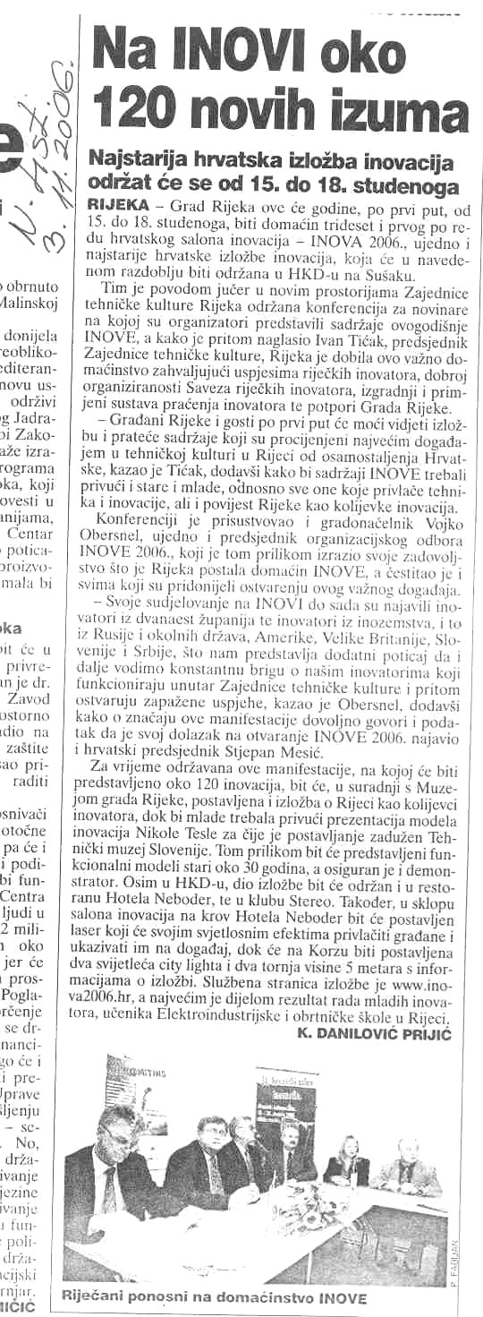 17.11.2006. RADIO RIJEKA - javljanje u Rijeka-info o događajima toga dana na Inovi - 8,00h (Iva Večerina) Prostorije HKD-a snimanje - KVK LIBURNIJA FILM RiTV- snimanje izložaka (inovacija) i snimanje demonstracija Teslinih izuma RADIO RIJEKA - Tatjana Sandalj, intervju sa inovatorima