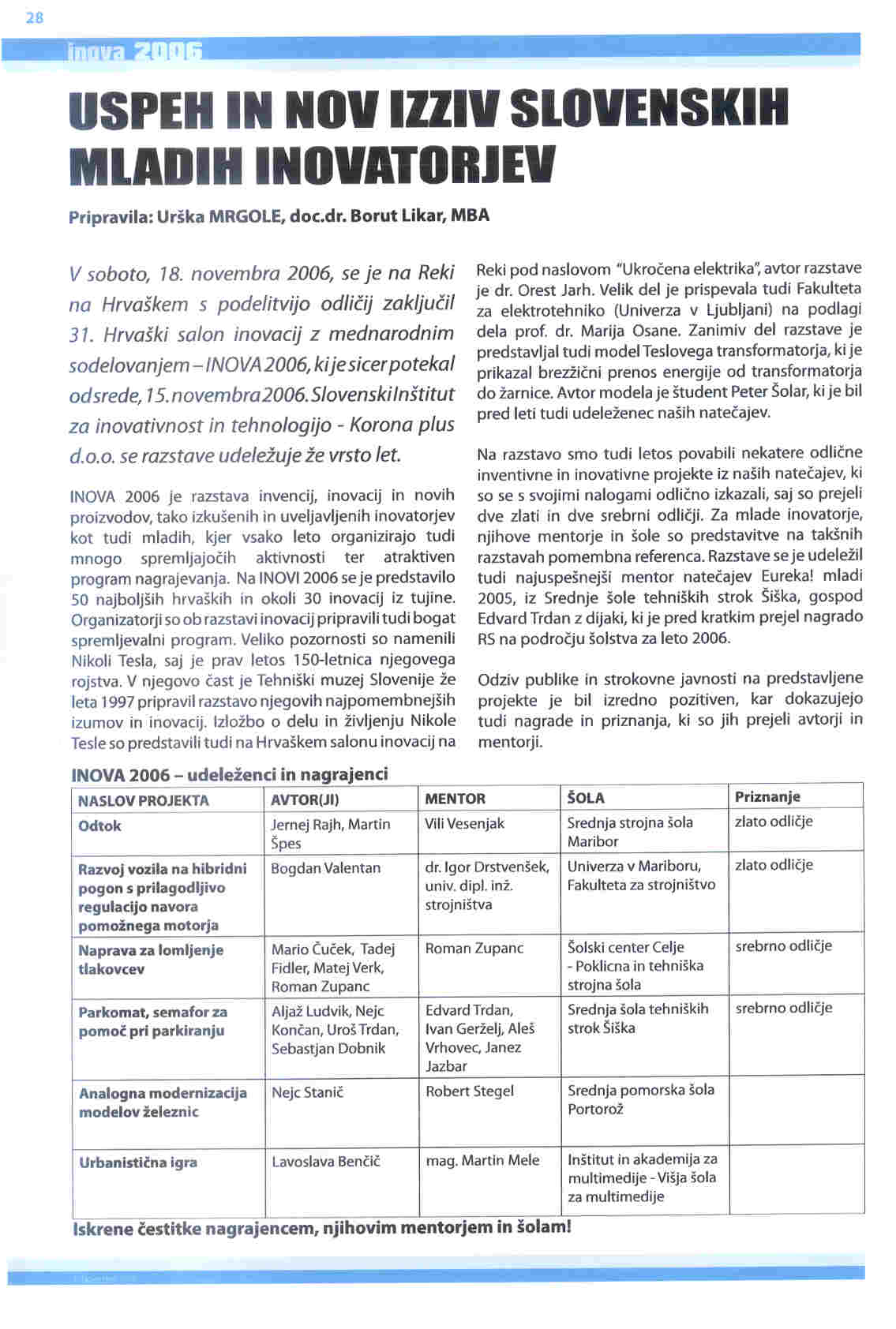 INOVA i dalje aktualna... Događaji nakon INOVE 2006. još čine ovaj događaj aktualnim. Niz primanja nagrađenih inovatora, pozivi za suradnju u novim projektima, dozvoljavaju da ovogodišnji 31. hrvatski salon inovacija svrstamo u posebno uspješni projekt. Ovogodišnji salon nije pobudio samo lokalnu pažnju nego se o INOVI govori širom republike Hrvatske, a nešto se publicira i izvan granica. Lijepo je što se govori sve najbolje o domaćinu Gradu Rijeci i o organizatoru koji je ovom izložbom pokazao da i izložbe inovacija mogu biti atraktivne.