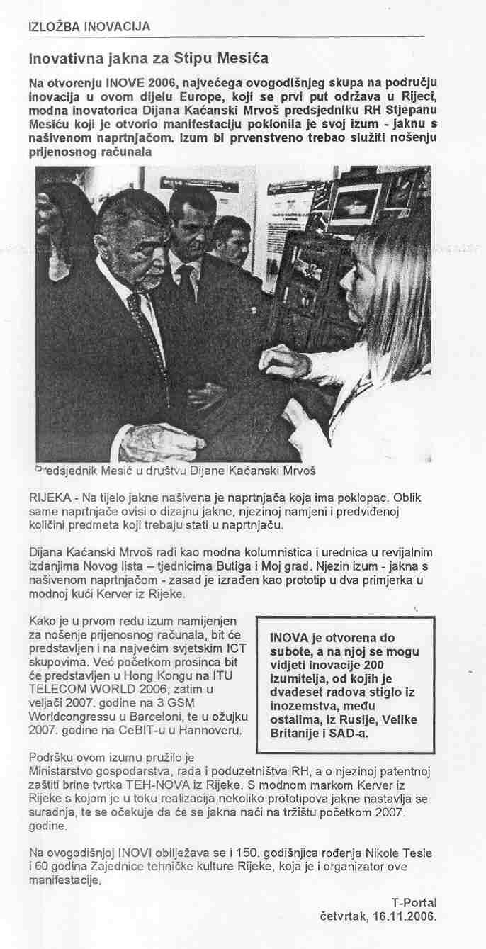 Isječci iz tiskovina i drugih medija o INOVI 2006 (2. dio): NOVI LIST GLAS ISTRE LA VOCE MOJ GRAD ŠIBENSKI LIST T-PORTAL 3. MAJ - INFORMACIJE POSLOVNE PRILOŽNOSTI |